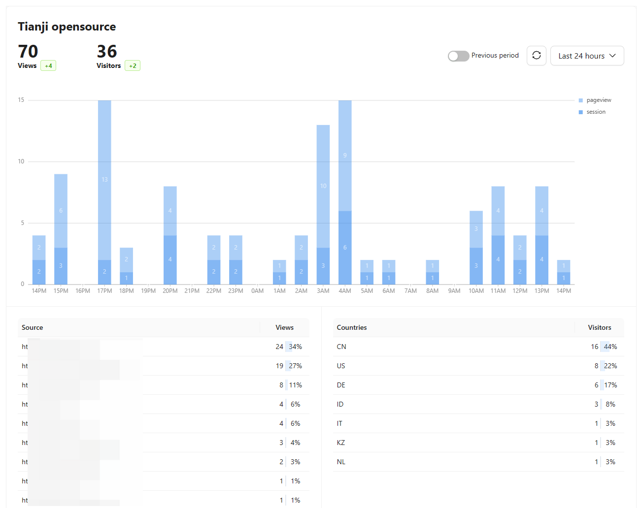 Wenn Sie keine eigene Lösung entwickeln möchten, empfehle ich Tianji. Als Open-Source-Projekt, das Website-Analytik, Uptime-Überwachung und Server-Status anbietet, hat Tianji kürzlich eine Telemetrie-Funktion eingeführt, um Content-Erstellern bei der Meldung von Telemetrie zu helfen und so eine bessere Datenerfassung zu ermöglichen. Vor allem bedeutet Open-Source, dass Sie die Kontrolle über Ihre Daten haben und den Verkehr von mehreren Plattformen an einem Ort aggregieren können, wodurch die Fragmentierung beim Betrachten derselben Informationen an verschiedenen Orten vermieden wird.