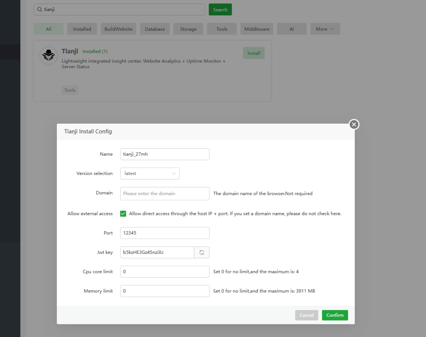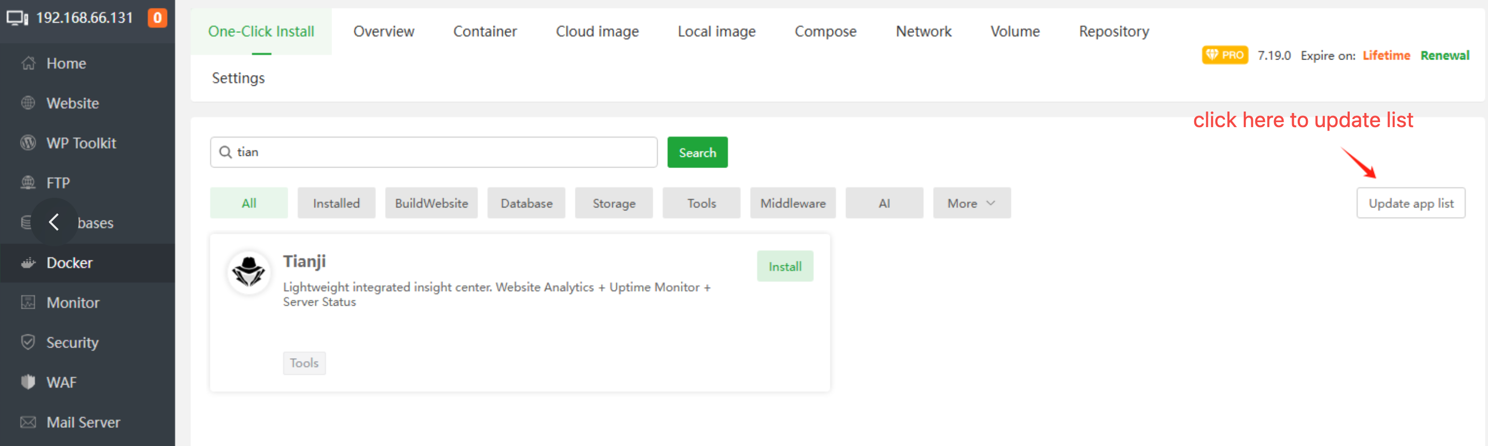 Barra de navegación docker -> instalación con un clic -> buscar tianji